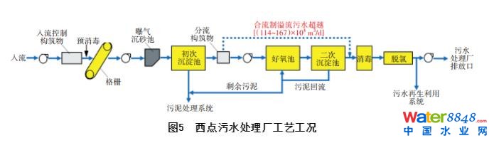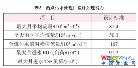 西點(diǎn)污水處理廠建于1965年,1995年被認(rèn)定為具備二級(jí)處理水平,來(lái)水包括家庭和商業(yè)污水以及西雅圖市工業(yè)廢水(約3.6×104m3/d),1999年被納入NPDES許可管理。西點(diǎn)污水處理廠設(shè)計(jì)處理能力見(jiàn)表3,工藝工況見(jiàn)圖5。當(dāng)雨天進(jìn)水流量>114×104m3/d時(shí),合流制溢流污水超越生物處理單元,經(jīng)消毒處理后與二級(jí)處理出水混合再排放。