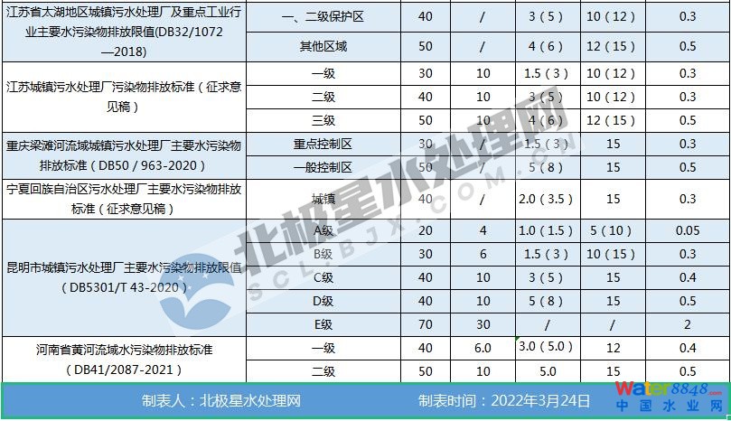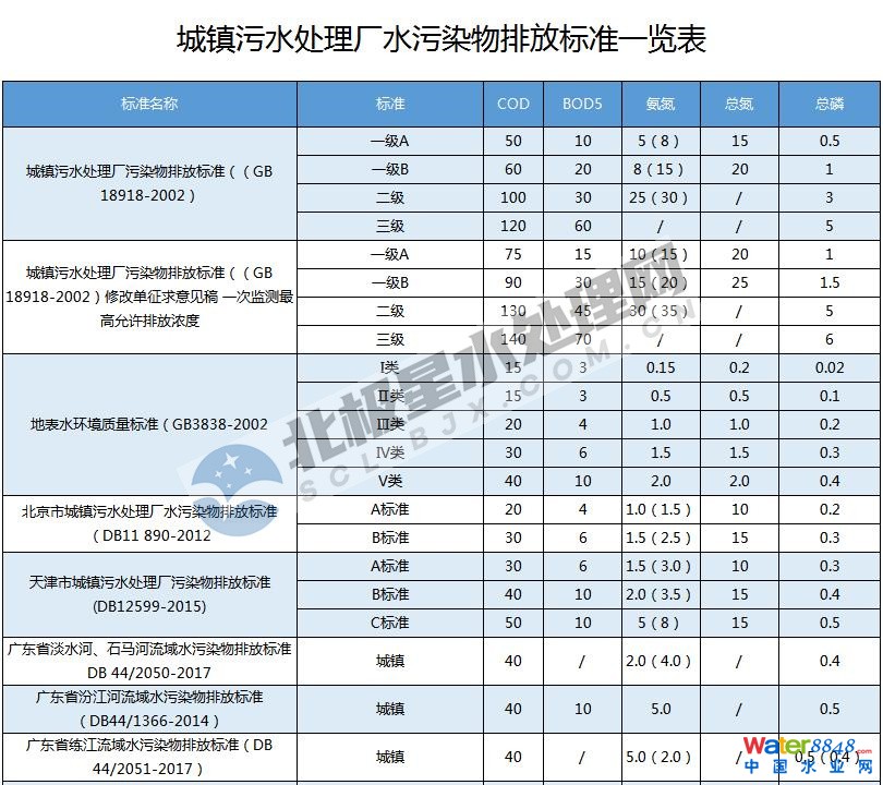 北極星水處理網特將全國各地城鎮(zhèn)污水處理廠水污染物排放標準整理如下: