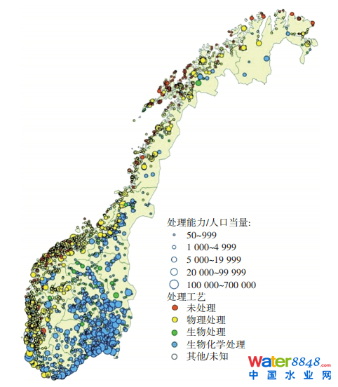 圖1挪威大規(guī)模污水廠的處理方式及分布