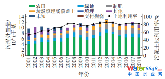 圖42001年—2018年挪威不同污泥處置方式的處置量及土地利用率