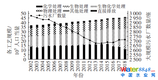 圖2挪威2002年—2018年污水處理廠數(shù)量、不同處理方式服務人口當量的變化情況