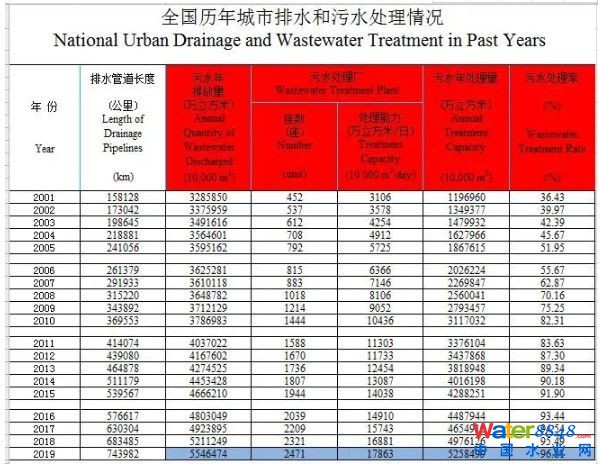 截止到2019年底,全國縣城共有生活垃圾無害化處理場(chǎng)(廠)共1378座,生活垃圾無害化處理能力為246729噸/日,無害化處理量為6609.78萬噸。 2、污水處理相關(guān)情況 截止到2019年底,我國城市污水年排放量為5546474萬立方米,污水處理廠2471座,日處理能力17863萬立方米,污水年處理量5258499.39萬立方米,污水處理率為96.81%。