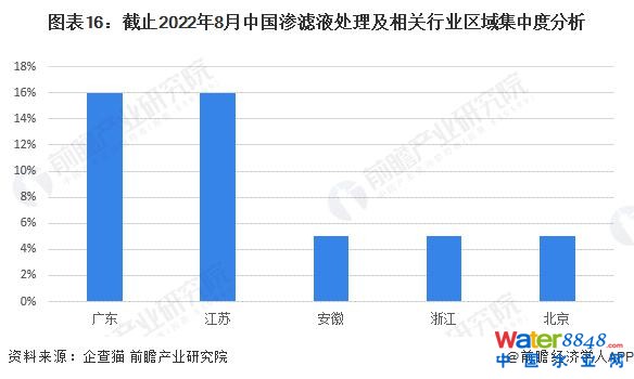 中國滲濾液處理行業(yè)的企業(yè)大多為地方性企業(yè),總體市場(chǎng)集中度不高。截至 2022 年 8 月,分區(qū)域來看,江蘇省與廣東省滲濾液處理企業(yè)集中度較高,分別占比 16%。第三名為安徽省,占比 5%?傮w來看,滲濾液處理行業(yè)除江蘇、廣東省外,區(qū)域競(jìng)爭(zhēng)較為分散,多為地方性企業(yè)。