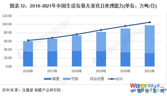 根據(jù)住建部的統(tǒng)計(jì)數(shù)據(jù),2016-2021 年我國生活垃圾無害化能力逐年增長,2020 年我國生活垃圾無害化處理能力實(shí)現(xiàn) 96.34 萬噸 / 日,其中垃圾填埋無害化處理能力 33.78 萬噸 / 日,垃圾焚燒無害化處理能力 56.78 萬噸 / 日,垃圾綜合處理無害化處理能力 5.78 萬噸 / 日。據(jù)初步核算,2021 年我國生活垃圾無害化處理能力達(dá)到 105.34 萬噸 / 日。