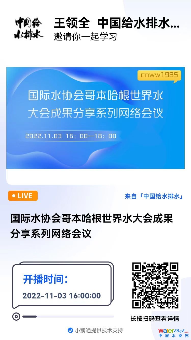國際水協(xié)會哥本哈根世界水大會成果分享系列網(wǎng)絡(luò)會議 直播時間:2022年11月3日 16:00—18:00 2022-11-03 16:00:00 開始