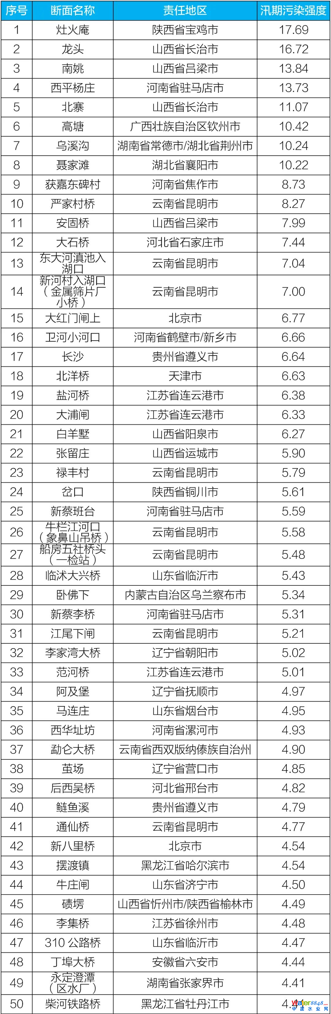 其中,陜西省寶雞市灶火庵?jǐn)嗝、山西省長(zhǎng)治市龍頭斷面、山西省呂梁市南姚斷面3個(gè)斷面,汛期污染強(qiáng)度位于全國前三名,分別為水質(zhì)目標(biāo)限值的17.7倍、16.7倍、13.8倍。