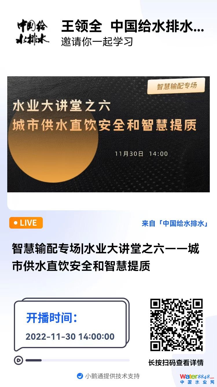 智慧輸配專場(chǎng)|水業(yè)大講堂之六——城市供水直飲安全和智慧提質(zhì) 直播時(shí)間:2022年11月30日 14:00—17:05 2022-11-30 14:00:00 開(kāi)始