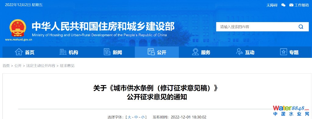 關(guān)于《城市供水條例(修訂征求意見稿)》公開征求意見的通知