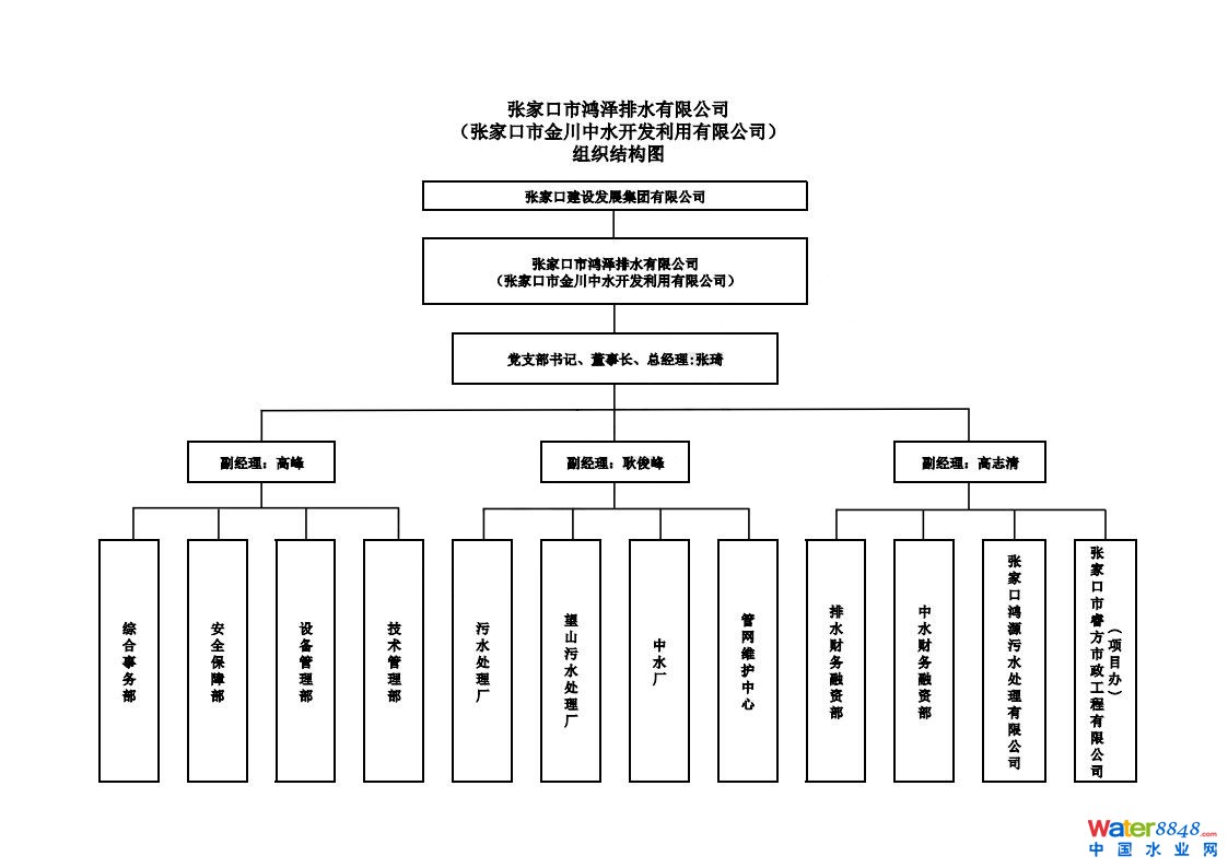 張家口市鴻澤排水有限公司成立于2002年8月,主要負(fù)責(zé)張家口市主城區(qū)污水處理項(xiàng)目的工程建設(shè)及污水處理設(shè)施的運(yùn)營管理。張家口市金川中水開發(fā)利用有限公司成立于2009年1月,主要負(fù)責(zé)張家口市主城區(qū)污水再生利用項(xiàng)目的工程建設(shè)和后續(xù)運(yùn)營管理。隨著城市化進(jìn)程的不斷加快,根據(jù)集團(tuán)公司產(chǎn)業(yè)調(diào)整需要,2016年5月張家口市鴻澤排水有限公司與張家口市金川中水開發(fā)利用有限公司機(jī)構(gòu)進(jìn)行合并實(shí)行統(tǒng)一管理,公司進(jìn)入了前所未有的發(fā)展階段。目前公司現(xiàn)有員工155人,其中本科及以上學(xué)歷71人,中共黨員56人。設(shè)有綜合事務(wù)部、財(cái)務(wù)融資部、技術(shù)管理部、設(shè)備管理部、安全保障部五個(gè)職能部門;污水處理廠、中水廠、望山園區(qū)污水處理廠、管網(wǎng)維護(hù)中心四個(gè)生產(chǎn)部門;擁有張家口鴻源污水處理有限公司、張家口市睿方市政工程有限公司兩家子公司。