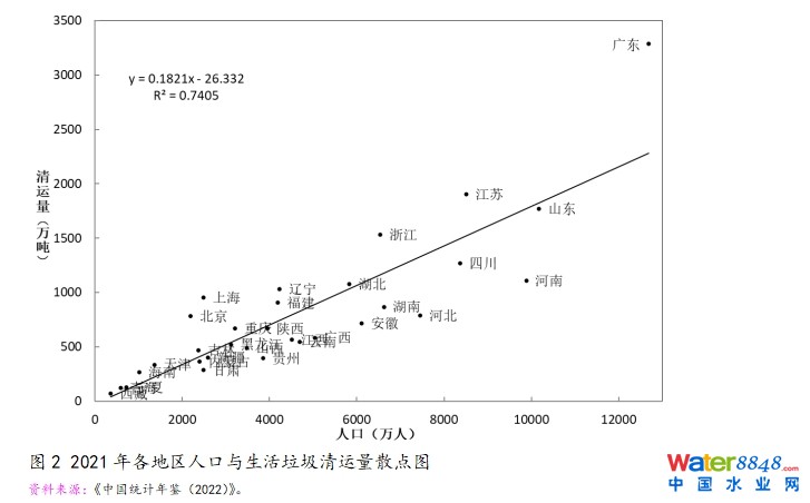我國是人口大國,生活垃圾產生量大,居世界首位。2021年,我國城市生活垃圾清運量為2.5億噸,如果加上0.7億噸縣城生活垃圾清運量,生活垃圾處理量達到3.2億噸。生活垃圾處理量與人口數量和經濟發(fā)展水平正相關。人口越多、經濟越發(fā)達,生活垃圾產生量越多。從2021年各地區(qū)人口數量與垃圾清運量散點圖來看,平均每增加1人生活垃圾清運量增加181千克。廣東、江蘇、浙江、北京和上海等經濟發(fā)達地區(qū)生活垃圾清運量偏多,而河南、四川、河北與安徽等地區(qū)的生活垃圾清運量要低于全國平均水平。北京和上海人均生活垃圾清運量最高,分別為358千克和384千克,遠高于其他地區(qū)。