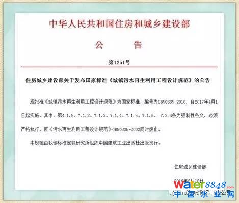 現(xiàn)批準《城鎮(zhèn)污水再生利用工程設計規(guī)范》為國家標準,編號為GB50335-2016,自2017年4月1日起實施。其中,第4.1.5、7.1.2、7.1.3、7.1.4、7.1.5、7.1.6、7.2.4條為強制性條文,必須嚴格執(zhí)行。原《污水再生利用工程設計規(guī)范》GB50335-2002同時廢止。