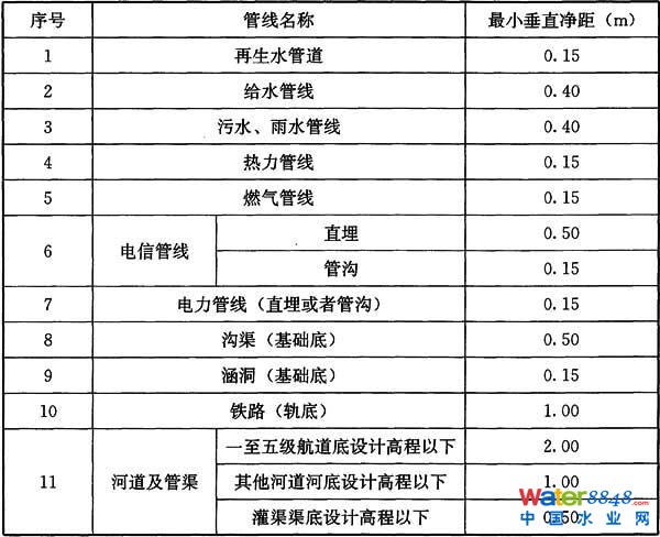 表B 再生水管道與其他管線最小垂直凈距(m)