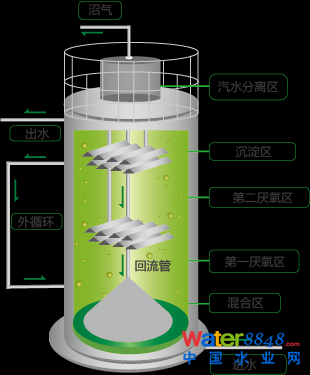 在醫(yī)藥、制藥廢水處理厭氧工藝段中,通常采用IC工藝(內(nèi)循環(huán)厭氧生物反應(yīng)器)。IC反應(yīng)器是新一代高效厭氧反應(yīng)器,由混合區(qū)、第一厭氧區(qū)、第二厭氧區(qū)、沉淀區(qū)和氣液分離區(qū)組成,是目前處理污水效能最高的厭氧反應(yīng)器。