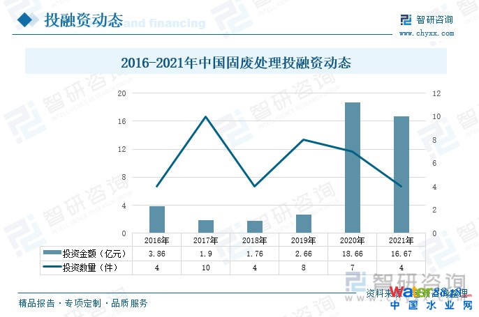 近年來,隨著國家和各級(jí)政府對(duì)于固廢危廢行業(yè)的扶持力度逐漸增大,行業(yè)發(fā)展提速,也逐漸受到資本市場的關(guān)注,2020、2021年行業(yè)獲得投資金額均突破15億元,達(dá)18.66億元、16.67億元,較往年迎來大幅增長。“十三五”“十四五”期間,固廢危廢的資源化利用得到快速發(fā)展,行業(yè)所獲得的資金持續(xù)增加,給行業(yè)帶來了新的發(fā)展機(jī)遇,行業(yè)發(fā)展步入新階段。