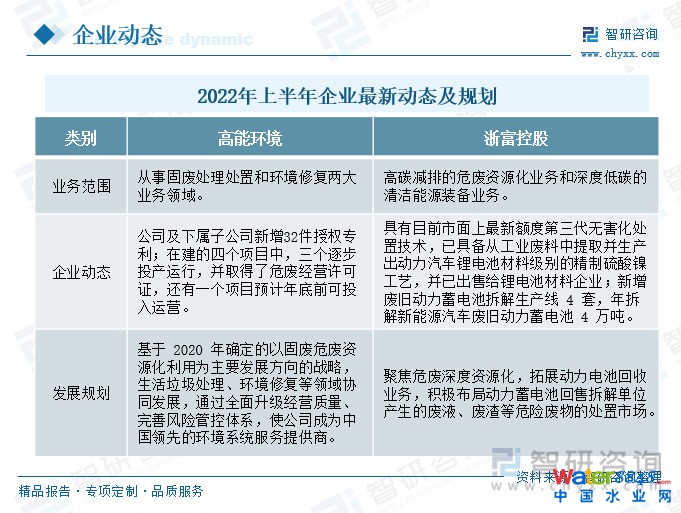 2022年上半年,高能環(huán)境在科研專利上取得了顯著的成果,公司及下屬子公司新增32件授權(quán)專利,并持續(xù)加大工程建設(shè),在建的四個(gè)項(xiàng)目中,三個(gè)逐步開始投產(chǎn)運(yùn)營,并獲得了危廢經(jīng)營許可證,另外一個(gè)項(xiàng)目預(yù)計(jì)年底前可投入運(yùn)營。在此期間,浙富控股則著重拓展動(dòng)力電池回售業(yè)務(wù),新增廢舊動(dòng)力蓄電池拆解生產(chǎn)線4套,年拆解新能源汽車廢舊動(dòng)力蓄電池4萬噸,積極布局動(dòng)力蓄電池回售拆解單位產(chǎn)生的廢液、廢渣等危險(xiǎn)廢物的處置市場。