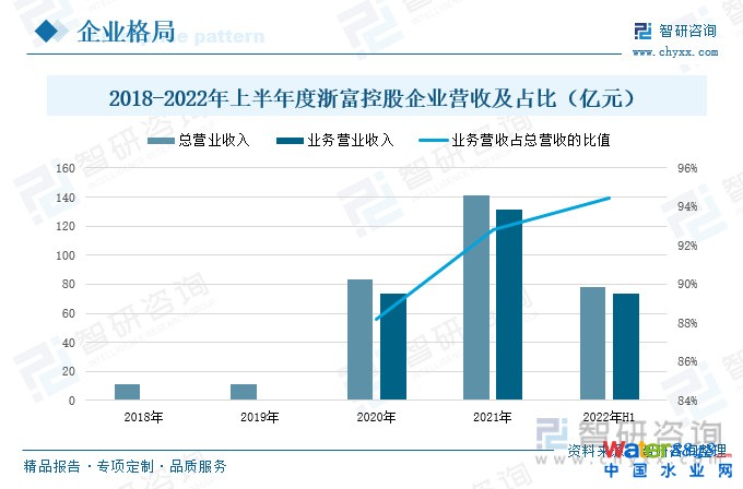 浙富控股業(yè)務(wù)領(lǐng)域主要涉及危廢資源化、清潔能源裝備板塊。在“清潔能源、大環(huán)保”發(fā)展戰(zhàn)略指引下,公司聚焦危險(xiǎn)廢物無害化處置及資源化回收利用領(lǐng)域,擁有集危險(xiǎn)廢物“收集-貯存-無害化處理-資源深加工”前后端一體化的全產(chǎn)業(yè)鏈危廢綜合處理技術(shù)與設(shè)施。2020年以來,浙富控股加快布局固廢危廢資源化利用領(lǐng)域,并取得了優(yōu)異的成效,2021年浙富控股固廢危廢資源化利用業(yè)務(wù)的營業(yè)收入為131.2億元,較2020年增長了78.26%,占2021年總營業(yè)收入的92.82%。2022年上半年浙富控股的總營業(yè)收入為78.04億元,較2021年同期增長了13.54%;固廢危廢資源化利用的營業(yè)收入為73.72億元,同比增長了13.63%。
