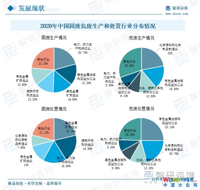 據(jù)生態(tài)環(huán)境部發(fā)布的《2020年中國生態(tài)環(huán)境統(tǒng)計(jì)年報(bào)》顯示,2020年我國工業(yè)固體廢棄物生產(chǎn)量靠前的行業(yè)有電力、熱力生產(chǎn)和供應(yīng)業(yè),黑色金屬冶煉和壓延加工業(yè),黑色金屬礦采選業(yè);在固廢的處置和綜合利用中,領(lǐng)先的行業(yè)有黑色金屬礦采選業(yè)、煤炭開采和洗選業(yè)、電力熱力生產(chǎn)和供應(yīng)業(yè),占比分別為21.3%、19.8%、16.9%。2022年我國危廢生產(chǎn)量主要集中在化學(xué)原料和化學(xué)制品制造業(yè),有色金屬冶煉和壓延加工業(yè),石油、煤炭及其他燃料加工業(yè)等行業(yè)領(lǐng)域;危廢處置排名靠前的主要有有色金屬冶煉和壓延加工業(yè),化學(xué)原料和化學(xué)制品制造業(yè),石油、煤炭及其他燃料加工業(yè),占比分別為25.1%、20.7%、12.3%。