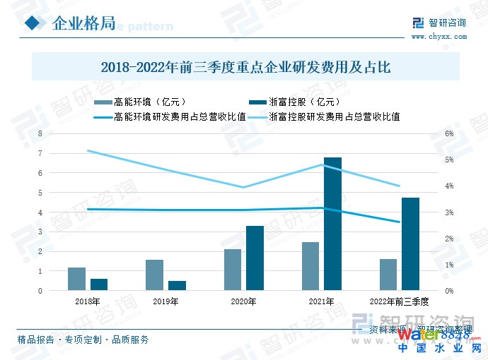 2018年以來,高能環(huán)境和浙富控股對(duì)于科研投入都較為重視,持續(xù)增加對(duì)于技術(shù)和項(xiàng)目的研發(fā)投入,高能環(huán)境在此期間的費(fèi)用投入較為穩(wěn)定,保持增長的態(tài)勢,浙富控股2020年在固廢危廢資源化利用領(lǐng)域布局過后,研發(fā)費(fèi)用激增,2020年過后,研發(fā)費(fèi)用大幅度增長。2022年前三季度高能環(huán)境的研發(fā)費(fèi)用為1.62億元,較2021年同期增長了24.47%,占總營業(yè)收入的2.62%;浙富控股的研發(fā)費(fèi)用為4.73%,同比微漲了0.3%,占總營業(yè)收入的4%。兩家企業(yè)對(duì)于固廢危廢處置行業(yè)的技術(shù)研發(fā)都較為重視,研發(fā)費(fèi)用逐年遞增,但總體上占總營收的比重小,存在較大的增長空間。
