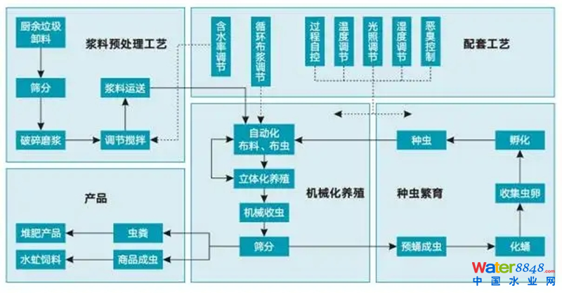 黑水虻處理廚余垃圾的工藝。第一步,廚余垃圾預(yù)處理,對廚余垃圾進(jìn)行過濾、分選、粉碎和堆放;第二步,接種幼蟲,將預(yù)處理后的廚余垃圾平鋪在垃圾處理箱中,然后將黑水虻蟲卵孵化后的幼蟲接入到廚余垃圾中;第三步,料蟲分離,將養(yǎng)殖處理完成后的黑水虻熟幼蟲和蟲糞收集和分離。