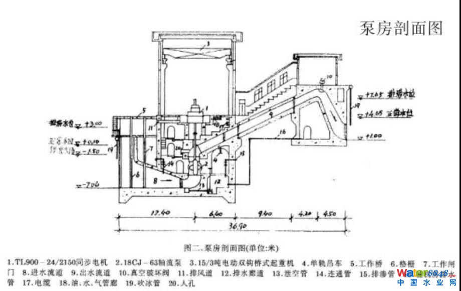 該泵站于1983年7月建成試車,一次成功。自1983年9月通水至今,經(jīng)連續(xù)運(yùn)行,情況良好。