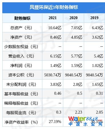 從目前公布的財報來看,鳳登環(huán)保 2021 年總資產(chǎn)為 10.64 億元,凈資產(chǎn)為 8.46 億元;近 3 年凈利潤分別為 1.49 億元(2021 年),1.59 億元(2020 年),1.02 億元(2019 年)。詳情見下表: