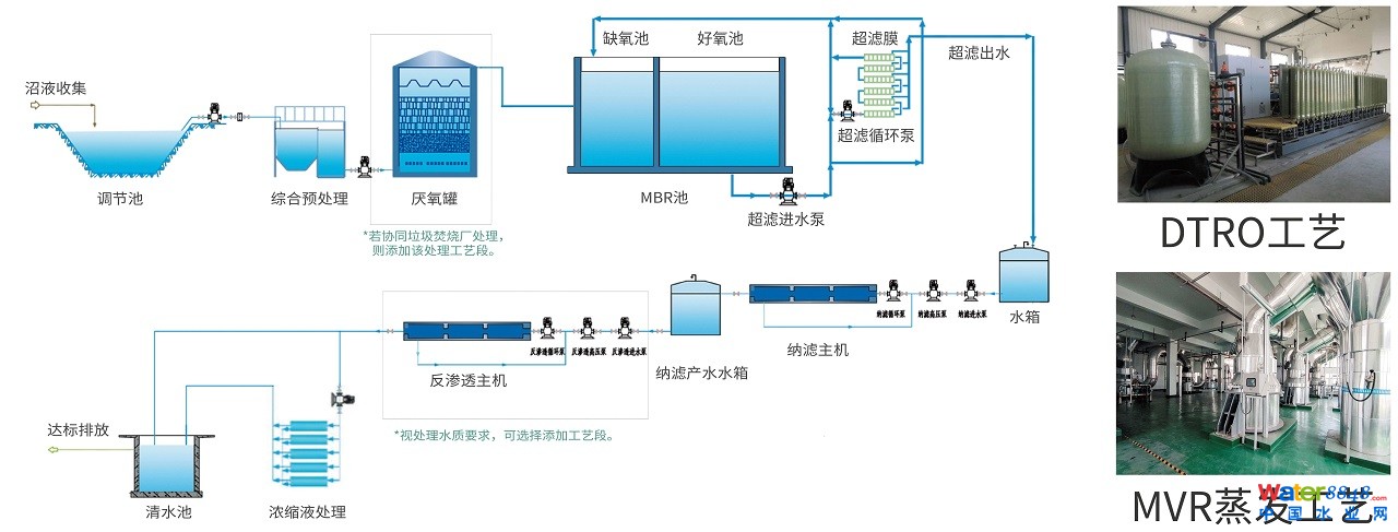 技術工藝:預處理→ 厭氧 →MBR→NF → RO →濃縮液處理→達標排放