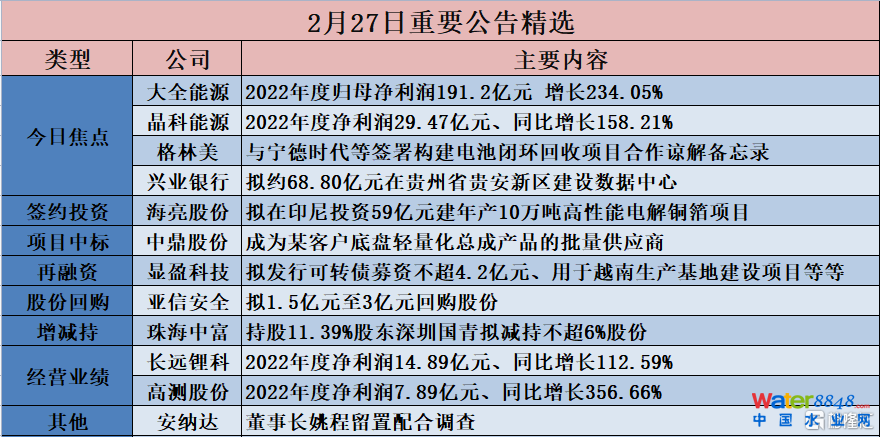 公告精選︱大全能源2022年度歸母凈利潤191.2億元同比增234.05%;格林美與寧德時代等簽署構(gòu)建電池閉環(huán)回收項目合作諒解備忘錄