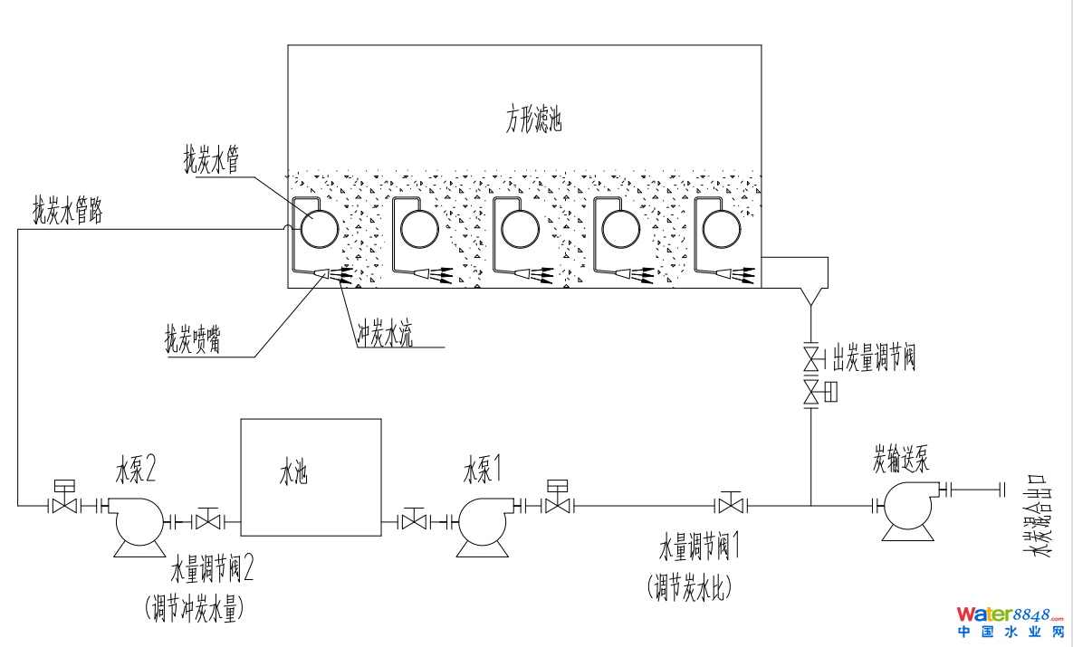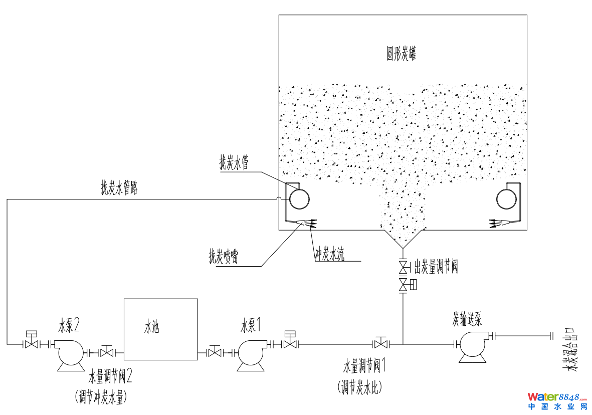 移炭過程: 炭移送時,打開出炭閥門、炭輸送泵以及水池右側(cè)水泵(通過水量調(diào)節(jié)閥調(diào)整水流輸出保證合適的炭水比),首先因高度落差和炭輸送泵的作用罐內(nèi)活性炭從出炭口排出。當罐內(nèi)活性炭移出到一定量時水池左側(cè)水泵打開,活性炭下方的攏炭管路通水,攏炭管路上的噴嘴向活性炭噴水使活性炭排出。