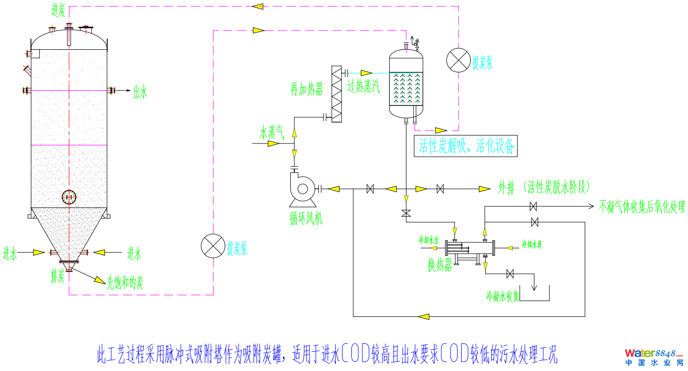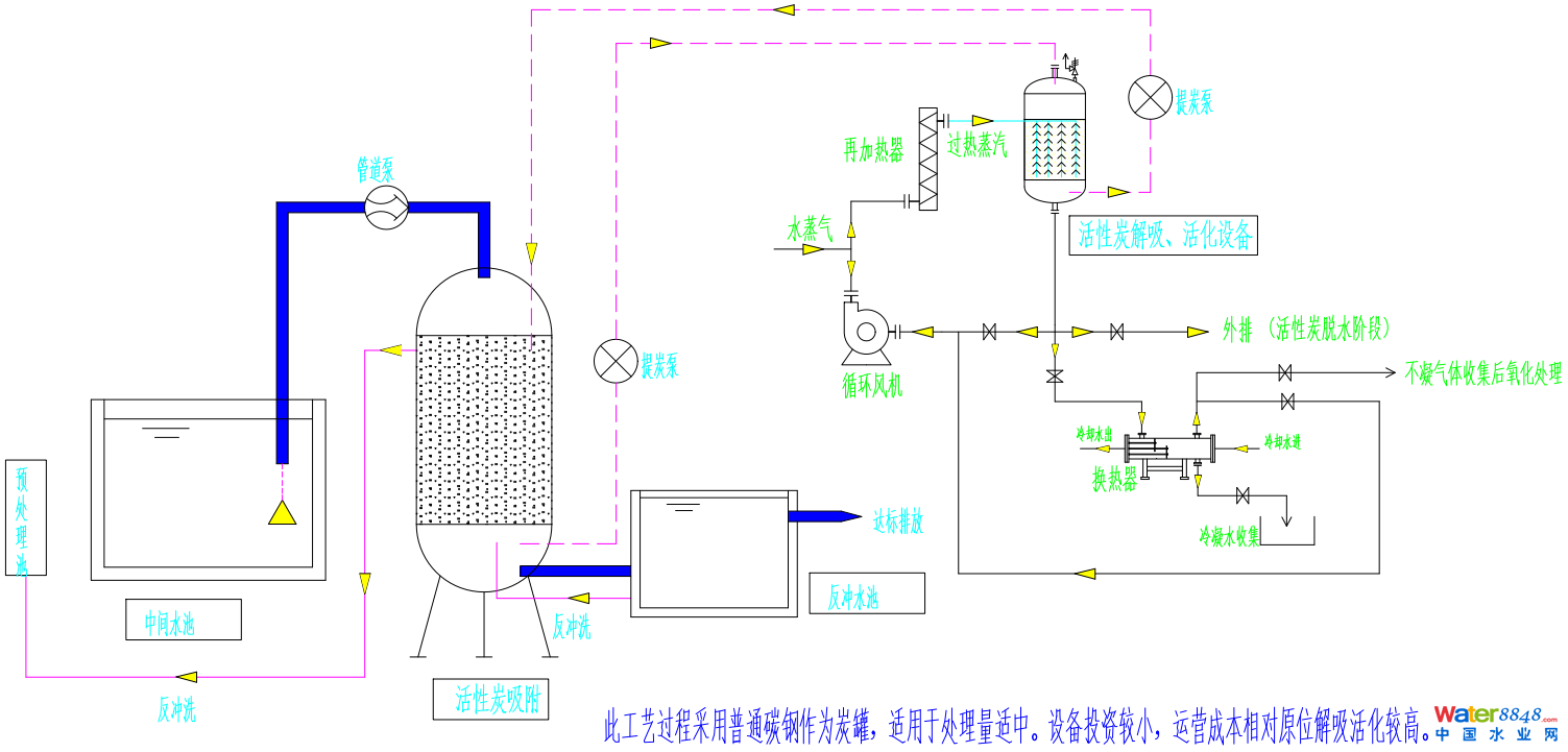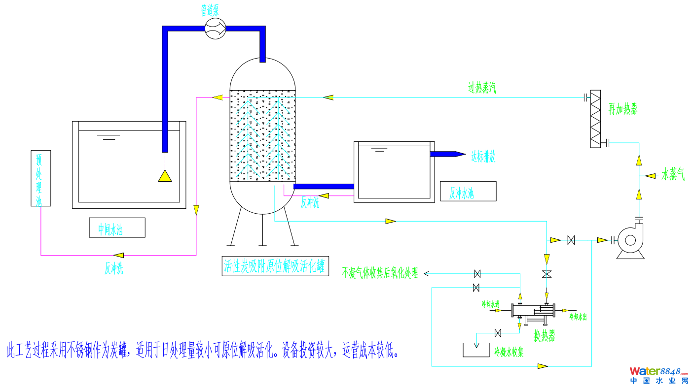 2)活性炭解吸活化泄壓時冷凝處理冷卻后的冷凝水集中收集再緩釋到前端調(diào)節(jié)池。