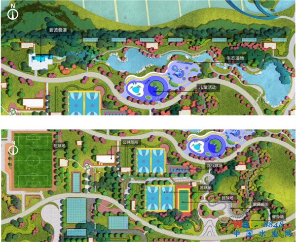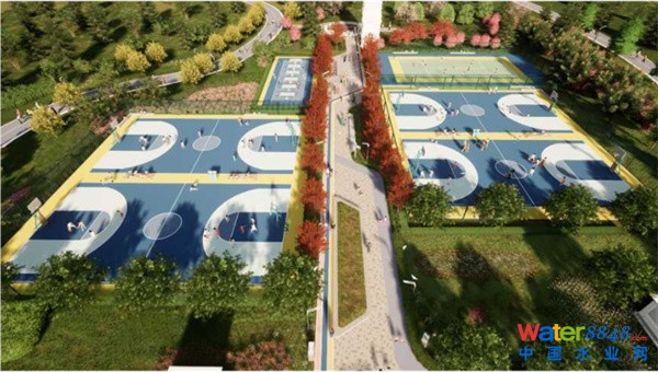 一期工程包含四大功能分區(qū):水光云涌—中軸景觀區(qū),悅水樂動—動感運(yùn)動區(qū),源清流潔—環(huán)保科普區(qū),水云清澗—綜合辦公區(qū)。場地內(nèi)設(shè)置1100m環(huán)形運(yùn)動跑道,設(shè)置12個運(yùn)動場地(1個籠式足球場、4個全籃球場、1個網(wǎng)球場、6個乒乓球場),1個綜合運(yùn)動器械場,1處兒童樂園等。