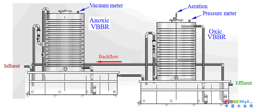 本新工藝則利用VBBR能很好地固定住微生物的特性,將缺(厭)氧與好氧VBBR串聯(lián)在一起,形成一套新穎的反應(yīng)器系統(tǒng)(如圖1所示)。該系統(tǒng)有效地克服了傳統(tǒng)A/O工藝的缺點(diǎn),在循環(huán)過程中污泥固定不動而只有水的循環(huán)流動,從而大大提高了硝化和反硝化反應(yīng)的效率。此外,由于前段的缺(厭)氧反應(yīng)器(An-VBBR)可以嚴(yán)格限制溶解氧的侵入,從而可以極大地提高有機(jī)碳源的利用率,進(jìn)而實(shí)現(xiàn)“極限脫氮”。