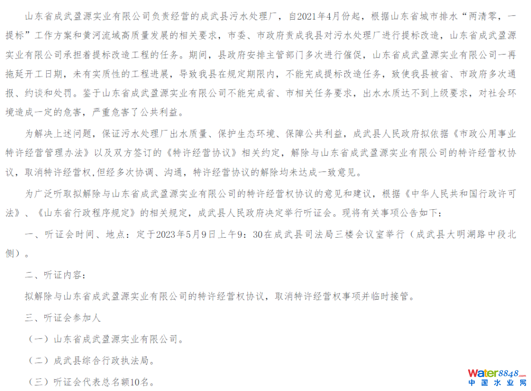 為“擬解除與山東省成武盈源實業(yè)有限公司的特許經營權協議,取消特許經營權事項并臨時接管”一事,成武縣人民政府決定舉行聽證會。