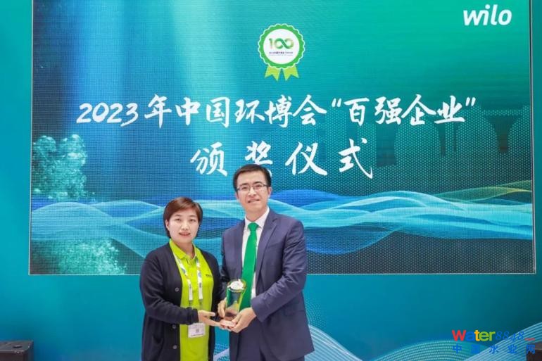 環(huán)保事業(yè)的發(fā)展中,如何降低溫室氣體排放,實(shí)現(xiàn)低碳綠色的發(fā)展?其主要的手段包括“節(jié)能”、“采用可再生能源”及“電氣化”、“智能化”,在此領(lǐng)域,威樂擅長的高效節(jié)能水泵解決方案均可發(fā)揮巨大的作用。2023年環(huán)博會(huì)上,組委會(huì)再次組織行業(yè)專家參與評審,在兩千余家參展企業(yè)中評選出百強(qiáng)企業(yè),威樂也再次獲得了這一榮譽(yù)。儀式現(xiàn)場,慕尼黑展覽徐佳女士向威樂中國銷售副總經(jīng)理陳華俊先生頒發(fā)了百強(qiáng)企業(yè)獎(jiǎng)杯。
