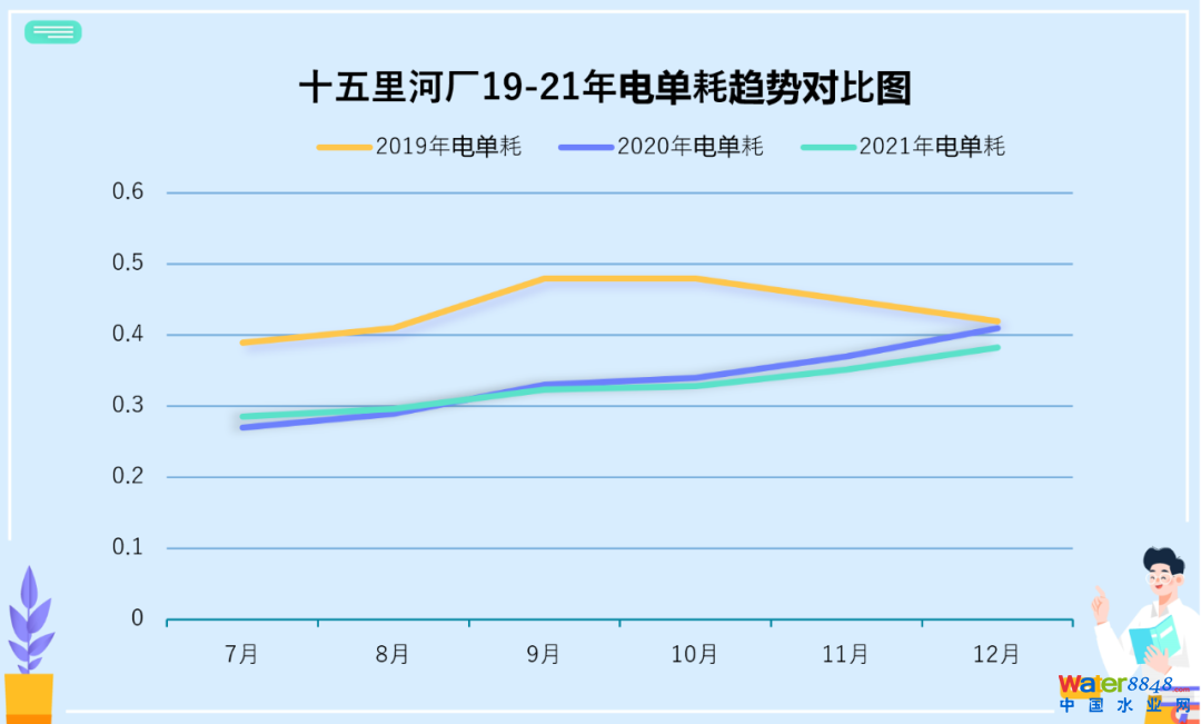 2019年至2021年全年噸水平均電耗分別為:0.420kWh/噸水、0.373kWh/噸水、0.364kWh/噸水,2021年電耗同比2019年下降約15%。
