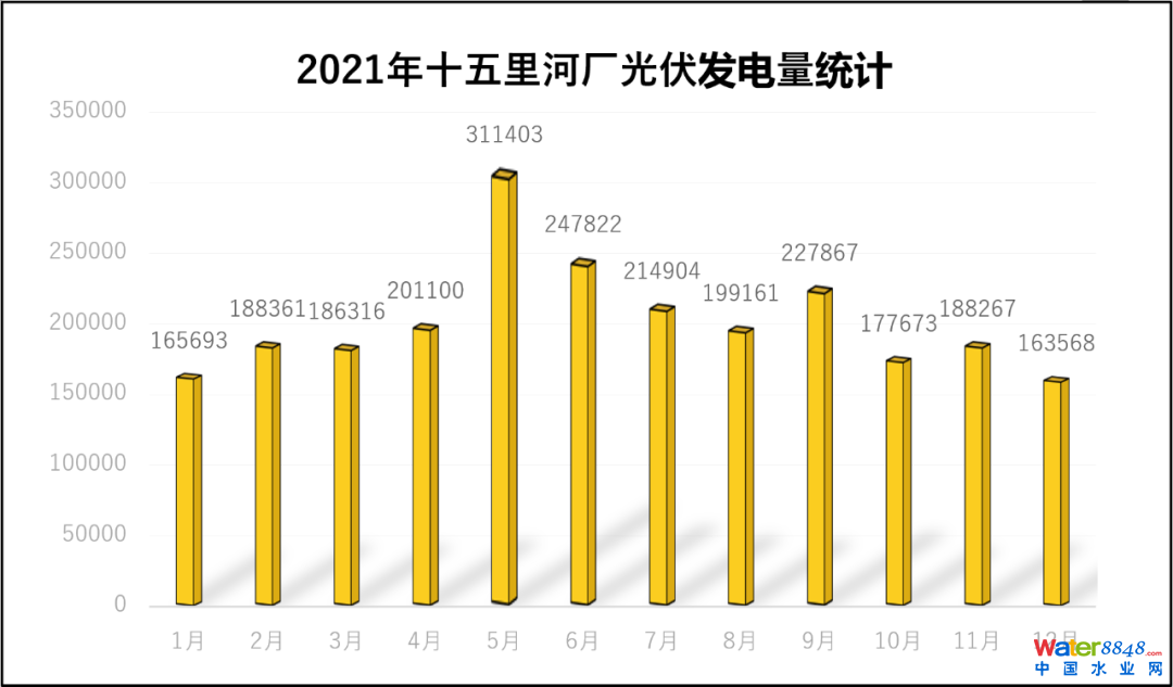 成效:十五里河分布式光伏發(fā)電項(xiàng)目2021年全年發(fā)電247.21萬(wàn)度,其中峰時(shí)電量97.03萬(wàn)度,平時(shí)電量142.01萬(wàn)度,谷時(shí)電量8.17萬(wàn)度,占廠區(qū)年總用電量7.61%,提升了污水廠能源自給比率,節(jié)省用電成本約25萬(wàn)元,所產(chǎn)生的電能無(wú)二次污染,符合清潔生產(chǎn)的理念。