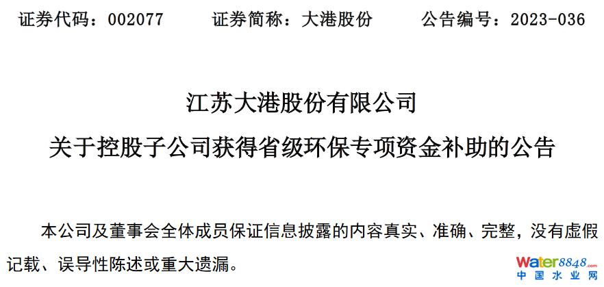 大港股份(002077)于6月5日發(fā)布晚間公告稱,江蘇大港股份有限公司(以下簡稱“公司”)控股子公司鎮(zhèn)江新區(qū)固廢處置股份有限公司(以下簡稱“新區(qū)固廢”)于近日收到鎮(zhèn)江新區(qū)生態(tài)環(huán)境和應(yīng)急管理局《關(guān)于撥付 2021 年度省級環(huán)保專項資金的函》,根據(jù)《鎮(zhèn)江市市級環(huán)境保護專項資金管理辦法》(鎮(zhèn)財規(guī)[2011]7 號)、《關(guān)于下達 2021 年度省生態(tài)環(huán)境保護專項資金的通知》(鎮(zhèn)財建[2021]96 號)等相關(guān)文件及 2021 年環(huán)境保護專項資金支持的原則和范圍,新區(qū)固廢所屬鎮(zhèn)江新區(qū)危險廢物安全填埋處置二期項目獲得 547.85 萬元資金補助。
