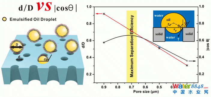 本研究中,通過(guò)濕法相轉(zhuǎn)化可控制備了系列不同孔徑大小的超親水、梯度微結(jié)構(gòu)中空纖維聚砜膜,并將其直接應(yīng)用于油水乳液體系,深入探究其微結(jié)構(gòu)與分離性能的內(nèi)在規(guī)律,以期為膜法油水分離應(yīng)用研究提供理論依據(jù)。實(shí)驗(yàn)結(jié)果表明,該不對(duì)稱、超親水中空纖維梯度微濾膜由于其特殊的梯度不對(duì)稱微孔結(jié)構(gòu)能夠有效降低膜孔道被污染堵塞的幾率,具有較佳的油水分離性能。膜孔尺寸及其寸分布、微結(jié)構(gòu)等均會(huì)影響實(shí)際油水分離效果,但本質(zhì)上通過(guò)臨界擊穿壓力直接作用。最重要的是,當(dāng)油滴大小與膜孔尺寸相匹配的條件下,即所用乳化油水粒徑與所用膜孔大小的比值(0.71)與通過(guò)相應(yīng)臨界突破壓力值理論計(jì)算所得表面接觸角的余弦值(0.72),膜材料水下油接觸角的余弦值(0.65)相近時(shí),膜對(duì)油水分離效率最佳(圖1所示)。聚合物膜孔微結(jié)構(gòu)與油滴尺寸之間的匹配內(nèi)在關(guān)系,可為膜法高效油水分離的實(shí)際應(yīng)用提供理論依據(jù)。