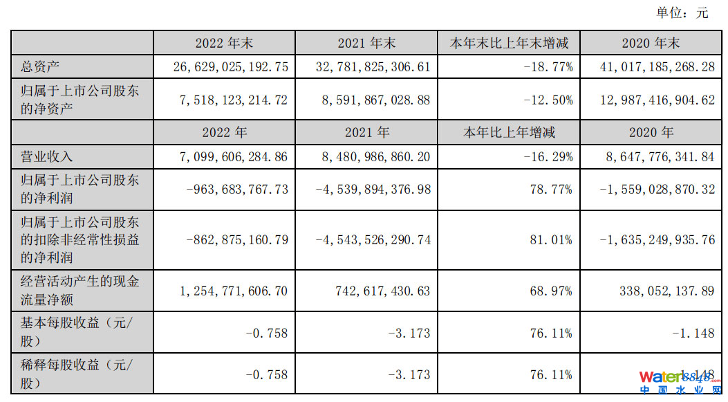 4月27日,啟迪環(huán)境發(fā)布2022年年報。其中顯示,2022 年,公司實現(xiàn)營收 71.00 億元,同比下降 16.28%;凈利潤-7.86億元,同比增長82.72%;實現(xiàn)歸屬于上市公司股東的凈利潤-9.64億元,同比增長78.77%。