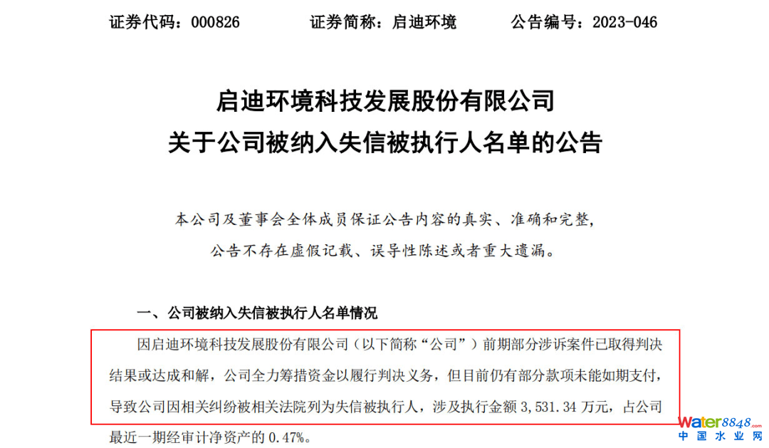 6 月 13 日晚間,啟迪環(huán)境發(fā)布公告稱,由于部分款項未能如期支付,導(dǎo)致公司被相關(guān)法院列為“失信被執(zhí)行人”,涉及執(zhí)行金額 3531.34 萬元。