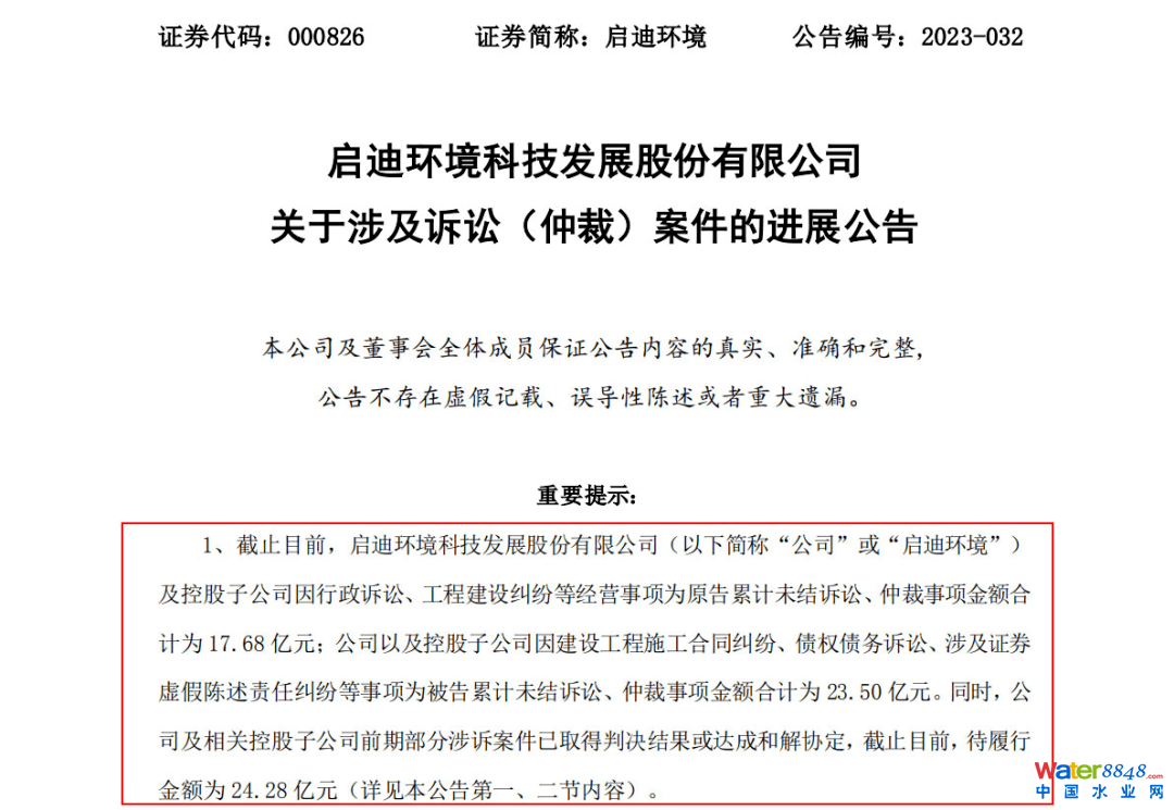 4 月 27 日,啟迪環(huán)境曾經(jīng)發(fā)布《關(guān)于涉及訴訟(仲裁)案件的進展公告》。其中顯示,截止目前,啟迪環(huán)境及控股子公司因行政訴訟、工程建設(shè)糾紛等經(jīng)營事項為原告累計未結(jié)訴訟、仲裁事項金額合計為17.68億元。
