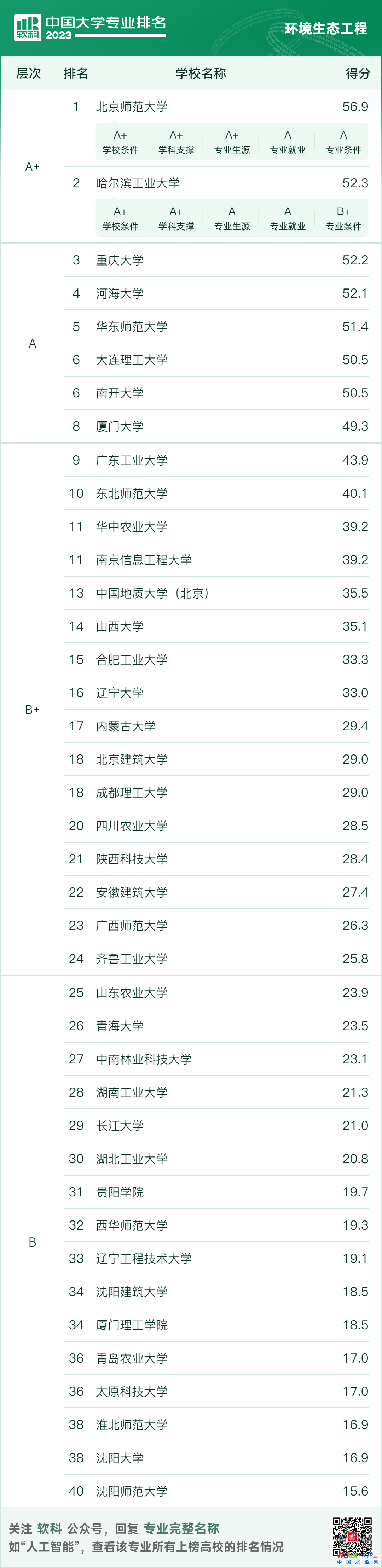 中國(guó)水網(wǎng)梳理環(huán)境科學(xué)與工程、環(huán)境工程、環(huán)境科學(xué)、環(huán)境生態(tài)工程、環(huán)保設(shè)備工程、資源環(huán)境科學(xué)、水質(zhì)科學(xué)與技術(shù)與給排水科學(xué)與工程共8個(gè)專業(yè)排名,結(jié)果如下:
