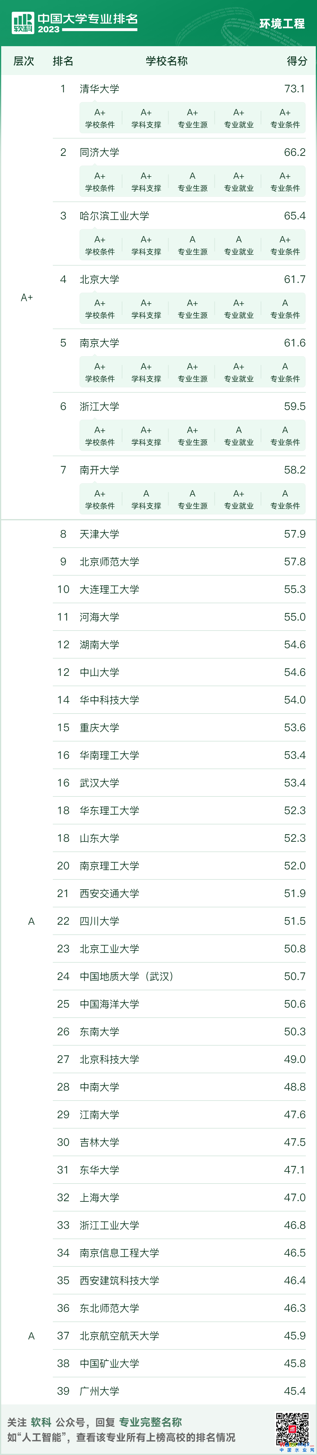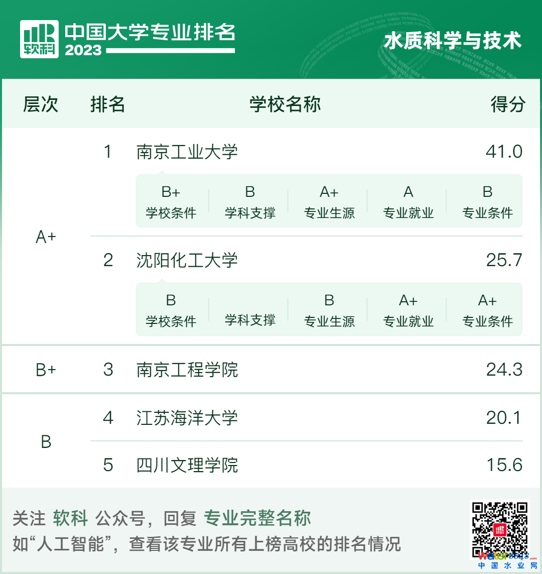 2023年6月15日,高等教育專業(yè)評價機構(gòu)軟科正式發(fā)布“2023軟科中國大學專業(yè)排名”。中國水網(wǎng)梳理環(huán)境科學與工程、環(huán)境工程、環(huán)境科學、環(huán)境生態(tài)工程、環(huán)保設備工程、資源環(huán)境科學、水質(zhì)科學與技術(shù)與給排水科學與工程共8個學科排名。