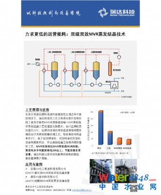 雙級雙效MVR蒸發(fā)結(jié)晶技術(shù) 在充分考慮處理料液進(jìn)料濃度較低且沸點(diǎn)升不高的情況下,瑞達(dá)科技的工藝工程師大膽開發(fā)和實(shí)踐了更加節(jié)能的MVR雙效降膜濃縮+MVR強(qiáng)制循環(huán)蒸發(fā)結(jié)晶工藝處理氯化鈉廢水,相比MVR單效或MVR雙級,蒸發(fā)噸水平均能耗降低20%以上,節(jié)能效果非常顯著,瑞達(dá)科技以技術(shù)的創(chuàng)新帶動能耗的降低,最終贏得客戶青睞。 |