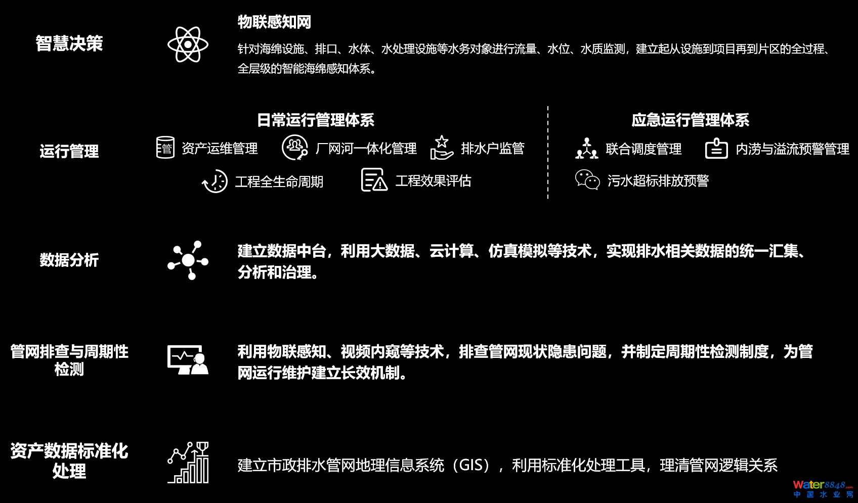 利用GIS技術(shù),對(duì)存量資產(chǎn)進(jìn)行標(biāo)準(zhǔn)化處理,經(jīng)拓?fù)錂z查后建立正確管網(wǎng)邏輯關(guān)系數(shù)據(jù)庫(kù);然后采用物聯(lián)感知、視頻內(nèi)窺等技術(shù)進(jìn)行管網(wǎng)排查和周期性檢測(cè),查明管網(wǎng)隱患問題,建立長(zhǎng)效管理機(jī)制;同時(shí)構(gòu)建信息化平臺(tái),利用大數(shù)據(jù)、云計(jì)算、仿真模擬技術(shù),對(duì)多來源、多尺度數(shù)據(jù)進(jìn)行量化分析,對(duì)工程建設(shè)效果進(jìn)行定量評(píng)估,為廠網(wǎng)河一體化運(yùn)行管理、調(diào)度決策等提供精細(xì)化、智慧化支持,為污水提質(zhì)增效提供解決方案。