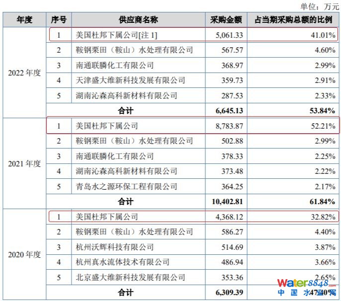 2021 年度,公司存在向美國杜邦下屬公司(浙江歐美環(huán)境工程有限公司、羅門哈斯電子材料(上海)有限公司和 ingeGmbH)合計(jì)采購比例超過采購總額 50% 的情形。