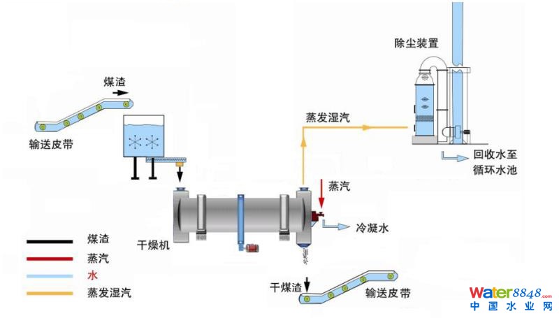 氣化細(xì)渣的處置符合穩(wěn)定化、無(wú)害化、減量化和力爭(zhēng)資源化的原則。本系統(tǒng)氣化細(xì)渣經(jīng)機(jī)械脫水(板框或真空帶式壓濾)后由皮帶機(jī)輸送出壓濾車(chē)間,然后轉(zhuǎn)載到干燥系統(tǒng)上料皮帶機(jī),經(jīng)皮帶機(jī)送至干燥機(jī)前緩沖倉(cāng),倉(cāng)內(nèi)設(shè)防堵機(jī)構(gòu),然后由倉(cāng)下正壓螺旋給料機(jī)將氣化細(xì)渣定量送入干燥機(jī)內(nèi)。在新型臥式蒸汽間接干燥機(jī)內(nèi)部安置了蒸汽加熱管,加熱管貫穿整個(gè)干燥機(jī),以同心圓方式排成3~5圈,干燥所需熱量由蒸汽加熱管提供,是間接連續(xù)干燥機(jī)。干燥后的氣化細(xì)渣從干燥機(jī)出料口經(jīng)皮帶機(jī)輸送裝車(chē)或裝倉(cāng)。