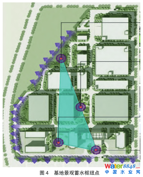 基地由于地勢高差采用臺地式布置,且道路采用放坡設(shè)計,基地內(nèi)部雨水流向、雨水收集、再循環(huán),皆可實現(xiàn)由內(nèi)部原本地勢形成自然遷移;貎(nèi)部可形成三個層級的雨水徑流系統(tǒng):一是基地道路采用市政道路的標(biāo)準(zhǔn),橫坡坡度 1.5%,縱坡坡度 3%,采用豁口路沿石、線性草溝、多濾層、速滲井等措施,降低道路徑流系數(shù),儲存利用雨水;二是采用小型 LID 模塊化設(shè)計項目,由人工安裝組合幾何模塊成綠色種植容器,如屋頂綠化箱、垂直或立體綠化組合箱、地板綠化箱等。此幾何構(gòu)建內(nèi)部可承擔(dān)根系阻力、儲水、過濾、排水、抗風(fēng)和參與雨水收集的作用。表面;三是利用基地內(nèi)自然高差形成的洼地設(shè)計了雨水花園,效仿傳統(tǒng)農(nóng)村“澇池”的理念,雨水借地勢匯流到低洼區(qū)域,下滲到由黃砂、礫石構(gòu)成的速滲井,作為蓄水調(diào)蓄的樞紐凈化、回補了地下水,確保水資源的綜合循環(huán)利用(圖 4)。