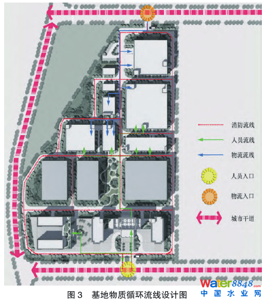 經(jīng)過深入分析中農(nóng)威特生物醫(yī)藥基地產(chǎn)業(yè)結(jié)構(gòu)特性、生產(chǎn)工藝等,在物理空間上實現(xiàn)產(chǎn)業(yè)合理布局、相互支撐的架構(gòu),塑造物質(zhì)、能量鏈供給網(wǎng)絡(luò)(圖 3)。生產(chǎn)區(qū)分布在基地北側(cè),最北側(cè)設(shè)置物流入口,且原材料及成品庫也設(shè)置在此,以便于轉(zhuǎn)運安全便捷;動物安檢、隔離、免疫區(qū)相對獨立且相互毗鄰,符合動物實驗及疫苗生產(chǎn)工藝流程;動力站分布于基地較為居中的區(qū)域,可最大程度減少輸送能耗;廢品回收與污水處理區(qū)域于基地北物流口,實驗動物尸體及其它廢品統(tǒng)一回收存放廢品運輸站,另行集中無害化處理后將其和麩皮、木屑等輔料按比例混合,可分別作為氮源和碳源,或利用微生物發(fā)酵,最終產(chǎn)物制成高檔有機肥料,形成生產(chǎn)廢料在基地內(nèi)部的產(chǎn)業(yè)閉環(huán)空間。