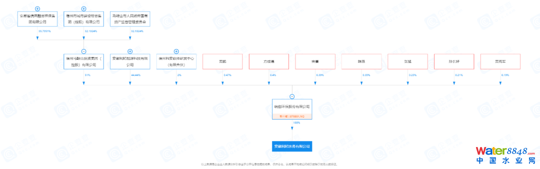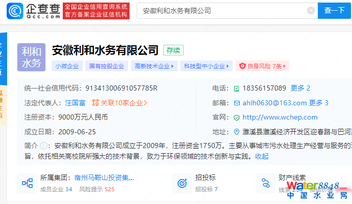 據(jù)企查查資料顯示,安徽利和水務有限公司為國有控股企業(yè),公示為皖創(chuàng)環(huán)保股份有限公司(簡稱“皖創(chuàng)環(huán)保”)全資子公司,皖創(chuàng)環(huán)保于2012年11月13日成立,為國有控股的上市掛牌企業(yè)。