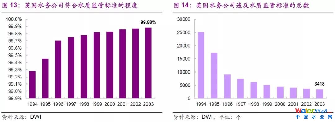 ◆1989年英國(guó)水務(wù)行業(yè)實(shí)現(xiàn)私有化,政府的支持和監(jiān)管的健全是其私有化成功的重要原因。1973年英國(guó)經(jīng)濟(jì)滯脹后,英國(guó)保守黨執(zhí)政并主張通過(guò)減少國(guó)家干預(yù)、發(fā)揮市場(chǎng)機(jī)制的方法來(lái)重新啟動(dòng)經(jīng)濟(jì)發(fā)展(從凱恩斯主義到自由市場(chǎng)經(jīng)濟(jì)的轉(zhuǎn)變),這也開(kāi)啟了英國(guó)歷史上規(guī)模最大,范圍最廣的私有化運(yùn)動(dòng),而英國(guó)水務(wù)私有化正是在全英私有化運(yùn)動(dòng)的大背景下進(jìn)行的。水務(wù)行業(yè)私有化后,投資及資本開(kāi)支的力度顯著增加(年均投資從15.5億英鎊到30億英鎊,近乎翻倍)、河流及應(yīng)用水水質(zhì)明顯改善(英國(guó)的水務(wù)公司在2003年符合飲用水標(biāo)準(zhǔn)的比率達(dá)到99.88%)、水廠運(yùn)營(yíng)成本得到有效控制,行業(yè)發(fā)展進(jìn)入新的階段。